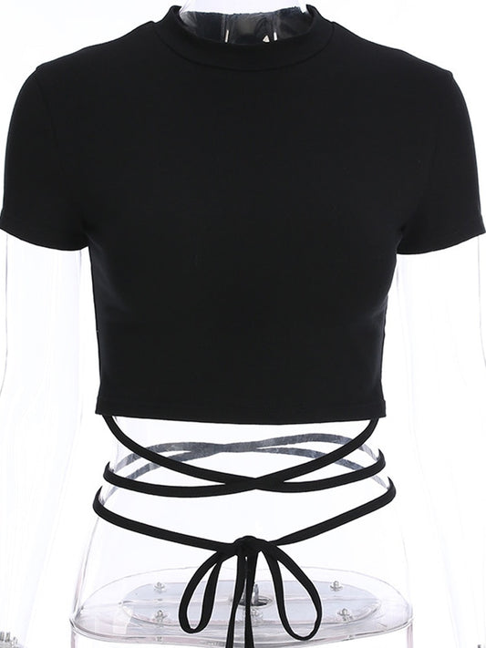 Kurzärmliges Cropped- Top mit Bändel am Bauch